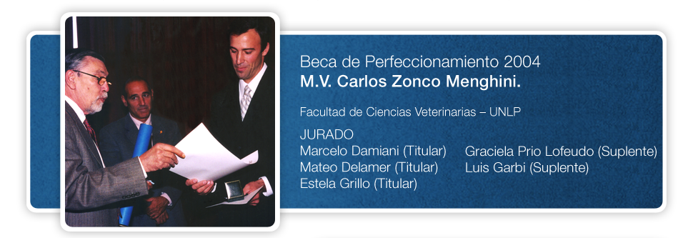 La decisión unánime del Jurado ha seleccionado finalmente al Dr. Zonco Menghini como recipiendiario del Premio “Beca de Perfeccionamiento” 2004. Confieso que acabo de conocer personalmente recién al colega, pero sé de sus valores a través de su amplio curriculum y cabe detenerse en los antecedentes del mismo. Ha tenido una muy temprana formación práctica en la especialidad, dado que sus padres han sido productores avícolas. Nacido en Bahía Blanca, es egresado de la Facultad de Ciencias Veterinarias de la Universidad Nacional del Centro de la Pcia. de Bs. As. con promedio sobresaliente. Casi inmediatamente se integra al cuerpo de profesionales de Supermercados Toledo de Mar del Plata en el año 1999, realizando inicialmente un periodo de entrenamiento por todos los sectores de producción avícola del citado establecimiento, luego de lo cual, y hasta el momento, y con solo 31 años, se desempeña ya como responsable de distintas áreas de la producción de parrilleros y ponedoras.